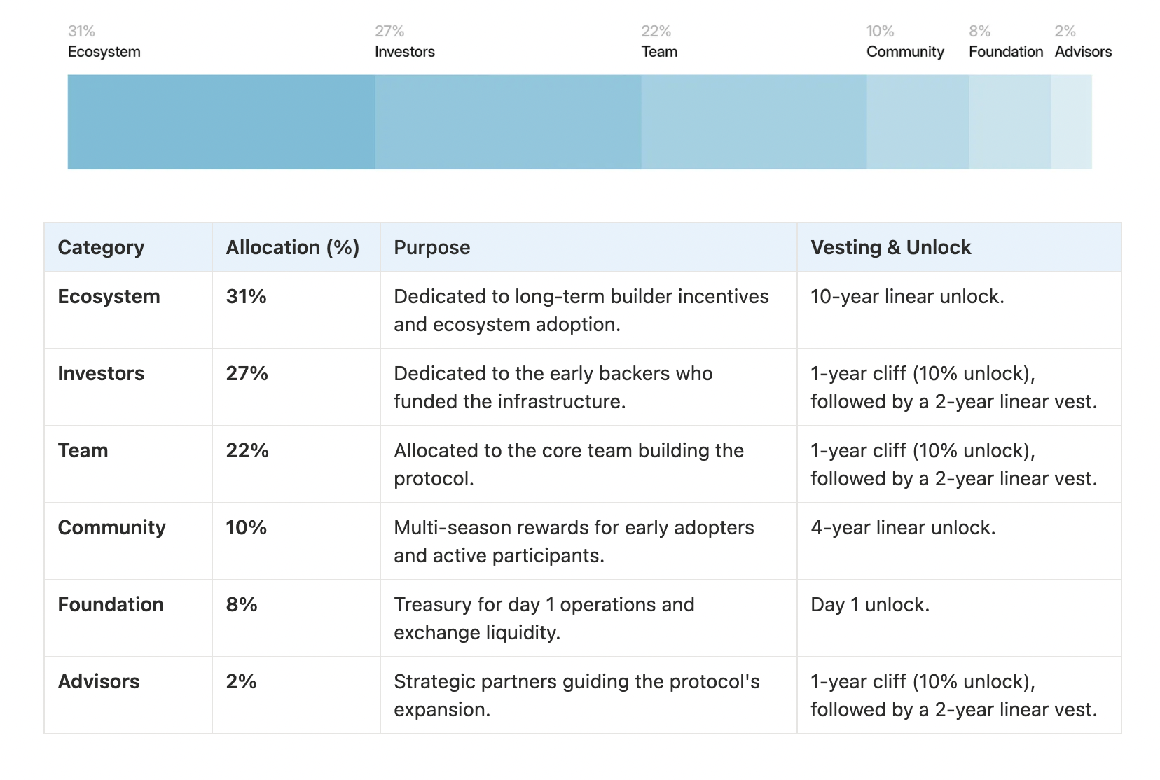 Important Distinction: The "Community" vesting schedule above refers to the long-term emissions of the total supply allocation. The Community Airdrop is separate and is NOT subject to the 4-year linear vesting.