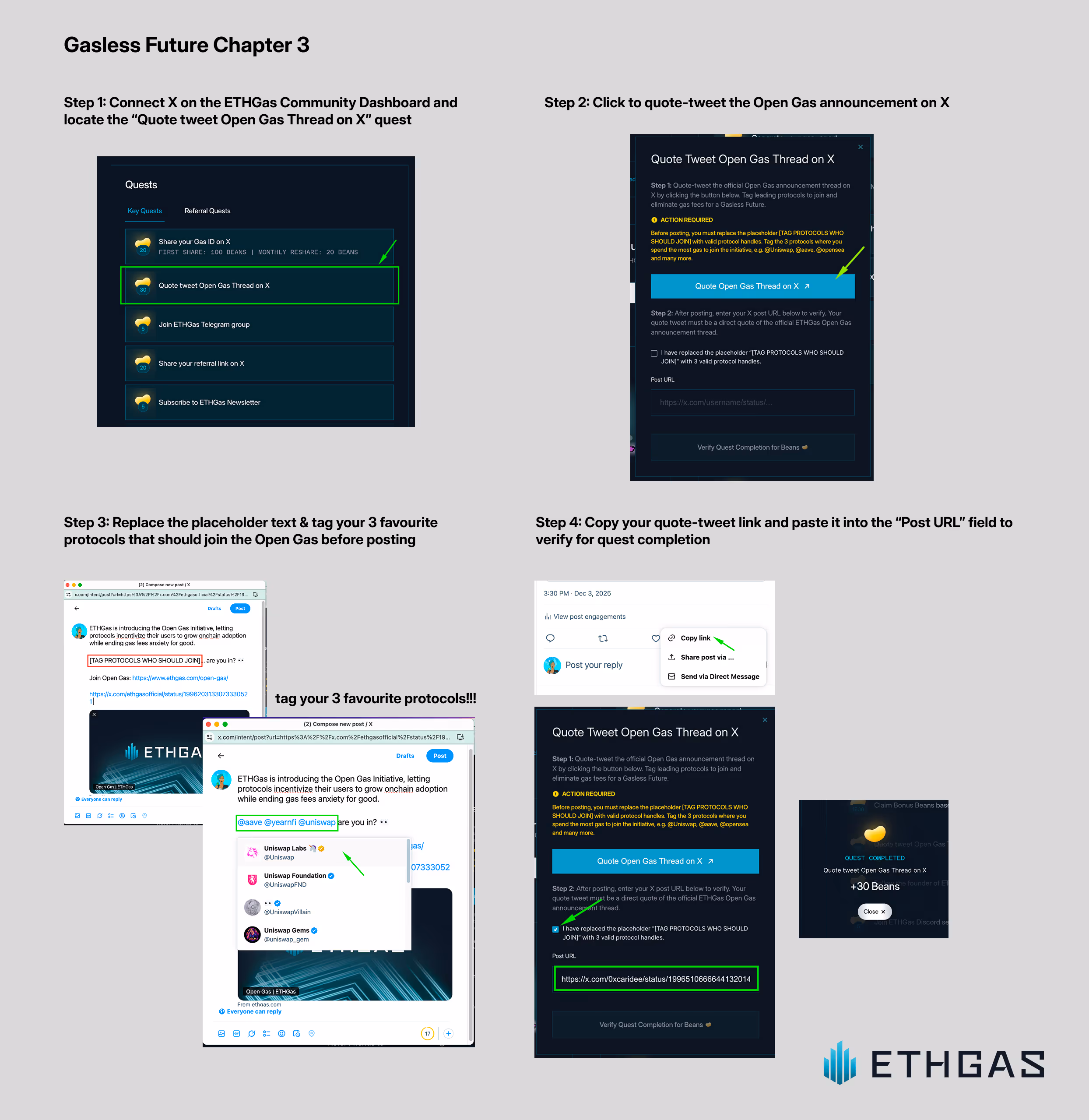 - Access Your Dashboard: Connect X to access your ETHGas Community Dashboard and locate the quest